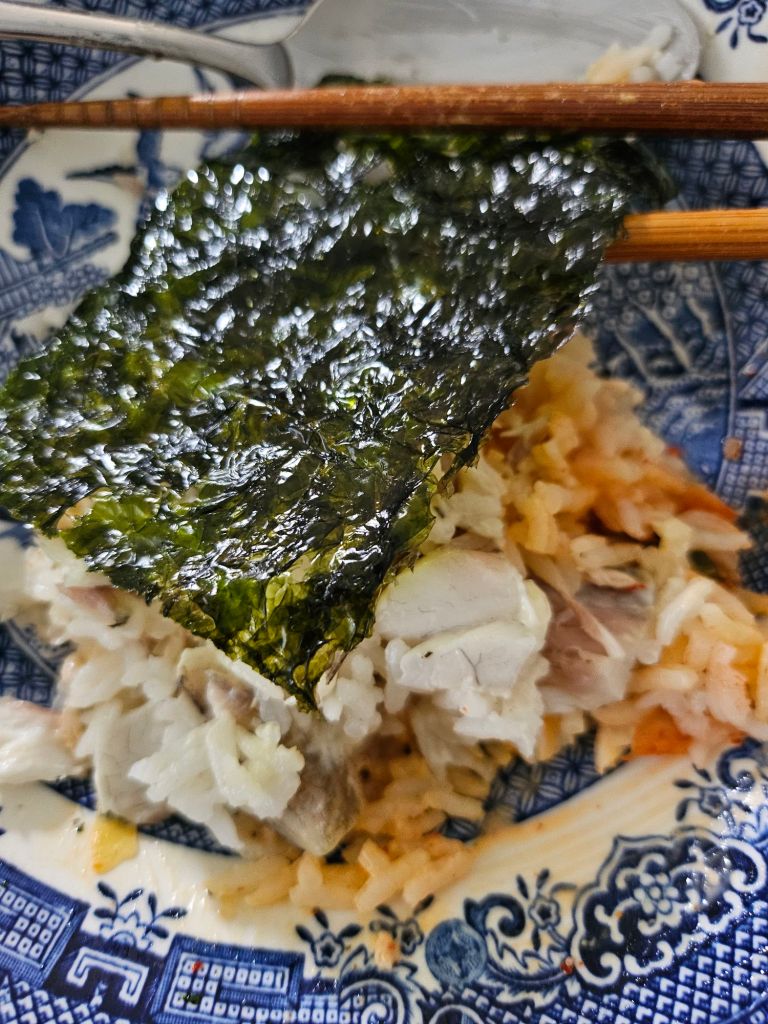 Just some rice, barramundi, kewpie mayo, salt and pepper, some kimchi and seaweed sheets…
