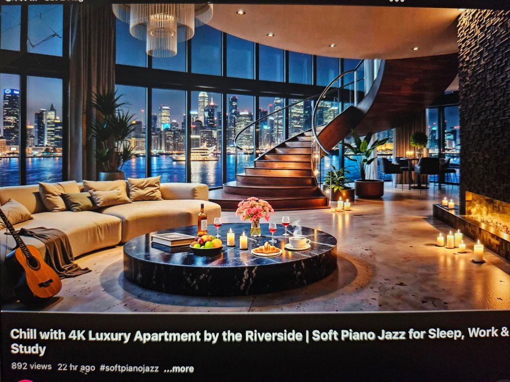 I like that staircase. I like that fireplace. I like the round dark marble coffee table. I don’t mind the couch and plants. And there’s a guitar for u to play!