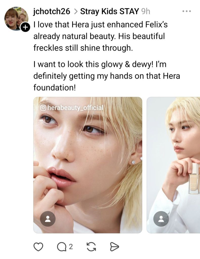 Yeah but I already know which Gucci Beauty products I like and suits me. If Lee Know does a Gucci Beauty campaign it’s just a reminder for me, “oh yeah, Gucci Beauty” — I could get some for my next Beauty top up.