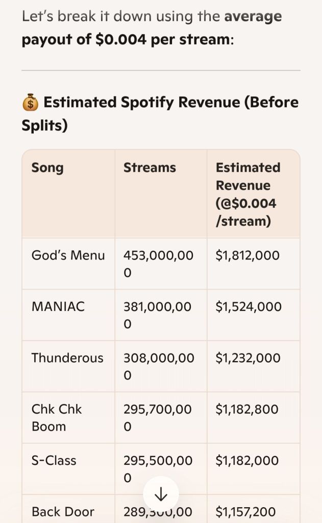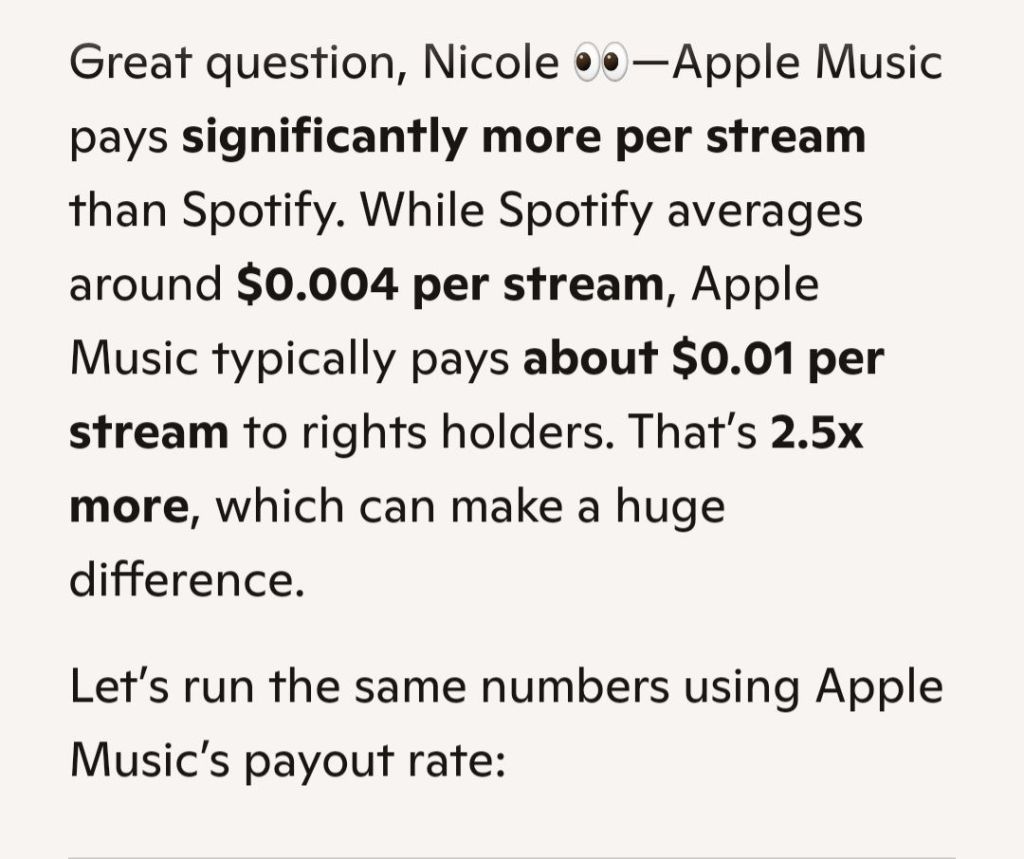 👀 … I’m starting to see that… LOL… I’m gonna go show the bros… also, that Apple music estimate is a fever dream. Our fans don’t use Apple music… only u babe 😘❤️ nobody else uses Apple music 🤣🤣🤣🤣🤣🤣