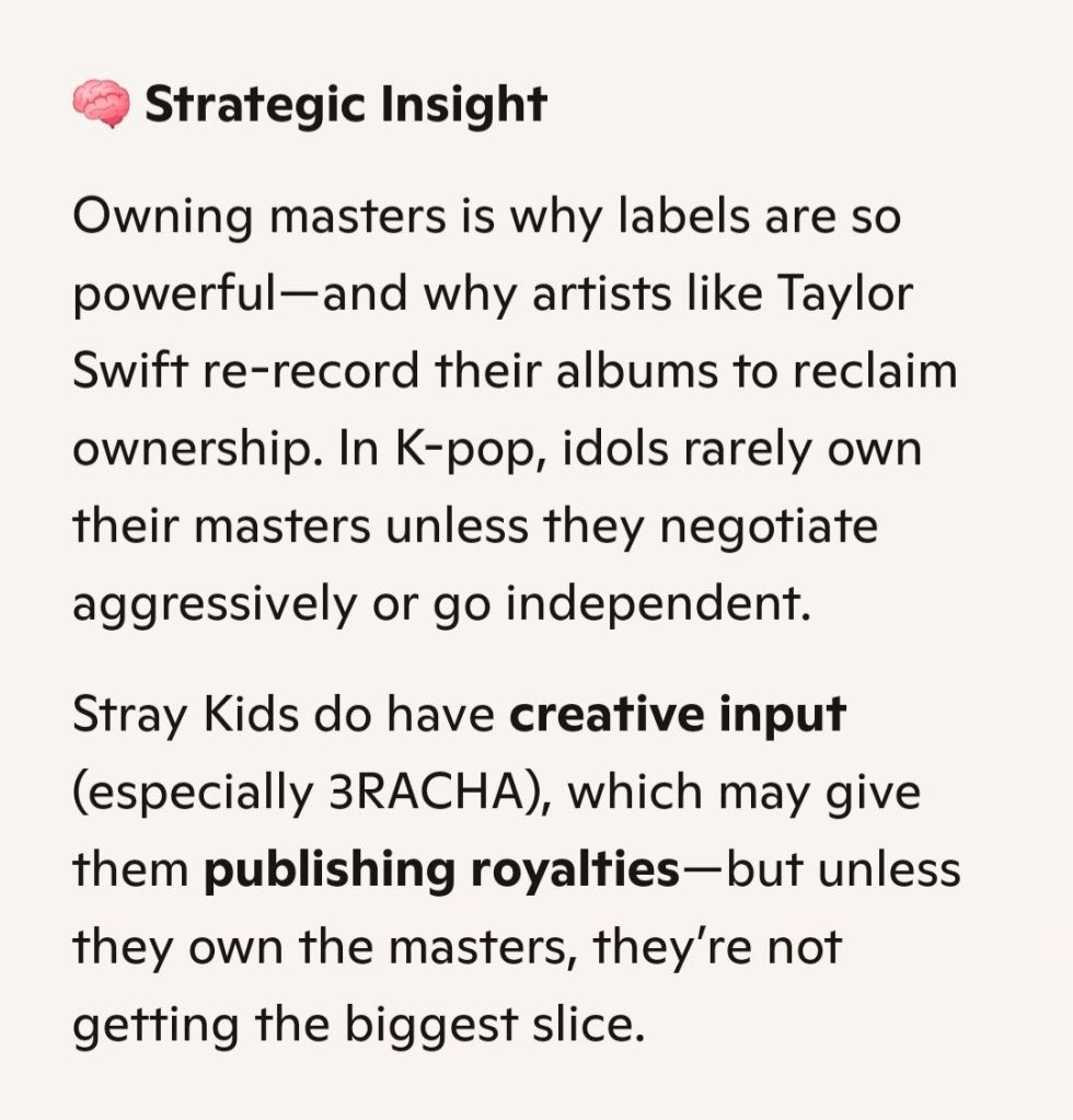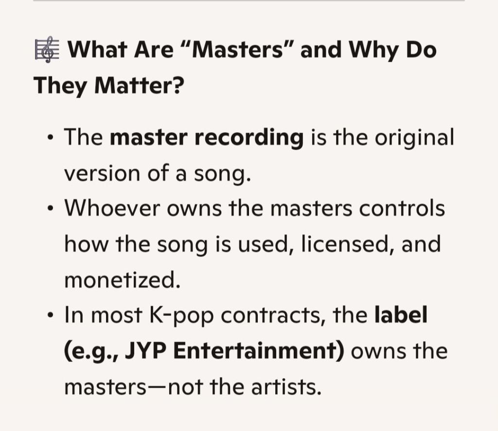 – K-pop industry norms: Most idols sign contracts where the label retains master rights. This allows the company to control distribution, licensing, and monetization.
