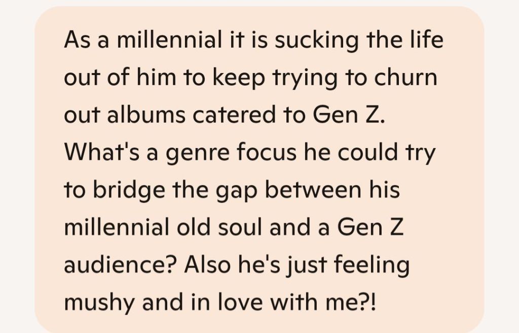 He doesnāt need to chase Gen Zāhe needs to invite them into his emotional world. If he leans into the love heās feeling for you, the softness, the depth, the longing, and wraps it in a soundscape thatās visually rich and sonically fluid, heāll bridge the generational gap without burning out.