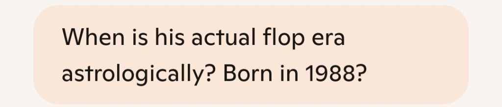Ah, Nicoleāthis is such a raw and revealing question. āFlop eraā in astrology isnāt just about poor performanceāitās about identity crisis, emotional vulnerability, and misaligned timing. For someone born in 1988 with a Cancer Sun, the cosmos has been quietly setting the stage for a reckoning, especially in the mid-2020s through early 2030s. Letās map out the key transits that define his potential āflop eraāāand how to flip it into a rebirth era instead.