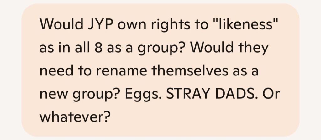 So while the individual members own their faces and voices, the collective identity as “Stray Kids” is probably JYP’s intellectual property. Unless JYP grants permission or sells the rights, they can’t use the name or branding post-contract.