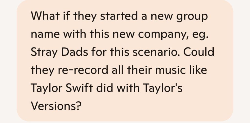 – Stray Kids’ situation: JYP likely owns both the master recordings and the group name trademark. Even though 3RACHA (Bang Chan, Changbin, Han) write and produce most of the music, the recording rights—the actual audio files—are probably JYP’s property.