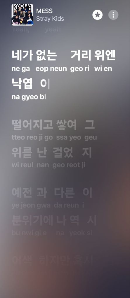 I know! I’ve seen other screen shots of other kpop songs on my timeline. There are songs with both translation and pronunciation appearing but evidently Stray Kids didn’t get their translations uploaded to APPLE MUSIC!!!