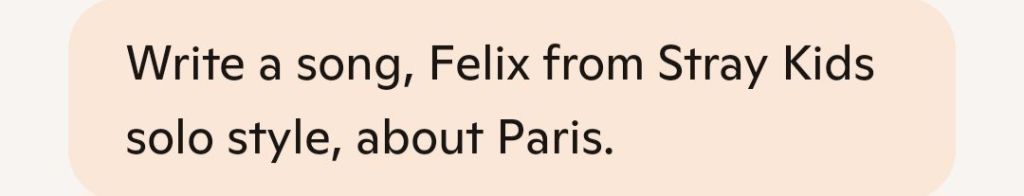 Hereās a solo-style song inspired by Felix from Stray Kidsāthink deep-toned vocals, cinematic production, and poetic imagery. The vibe is moody, romantic, and introspective, with Paris as both a place and a metaphor.