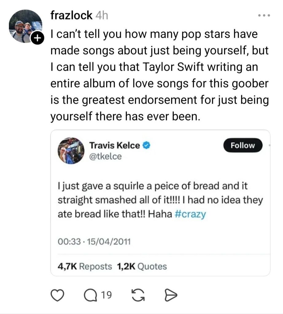 It’s like someone put in an AI prompt “write a Taylor Swift album that Travis Kelce is going to enjoy”