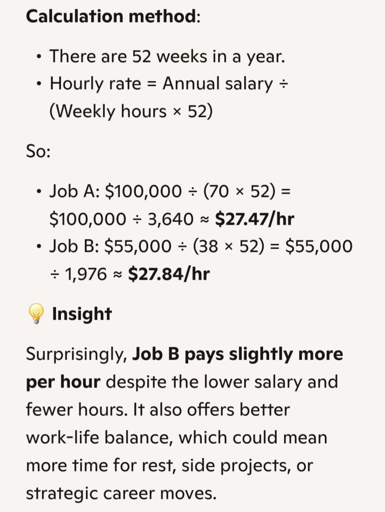 Say ur an investment banker. Ur salary is $100,000 a year. Sure that sounds like a big number. But the reality is u end up doing 70 hours per week instead of 38.