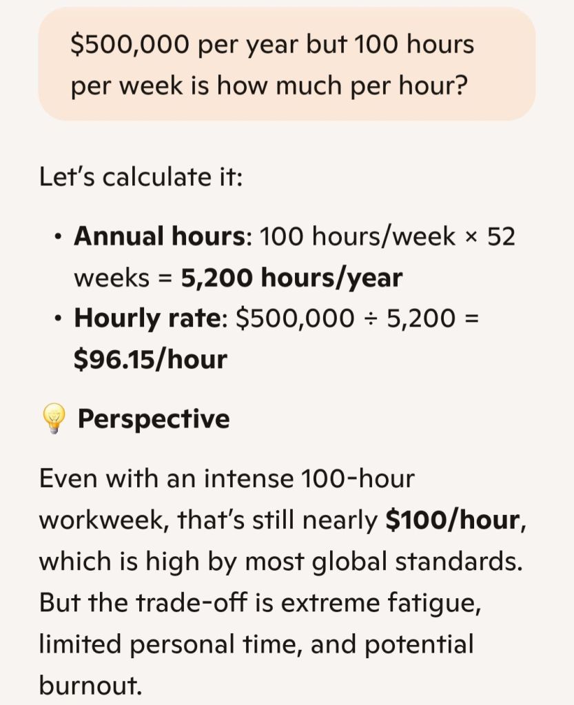 I’m not making $500,000 per year babe… u gotta round that number down… and ummm… I don’t know how u got 100 hours per week… but… it’s probably more… so… it’s even more skewed…