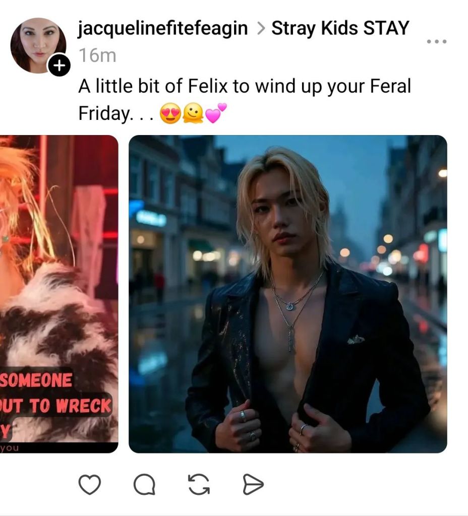 IT IS 100% A.I. AND I DON’T MEAN “HE’S SO HANDSOME HE LOOKS AI” I MEAN I KNOW THAT IS AN AI ART OF FELIX! HE HAS NEVER POSED LIKE THAT IN THOSE CLOTHES WITH THAT BACKGROUND AND THAT SIMPLY ISN’T HIS CHEST OR ABS. I KNOWWWWW ๐