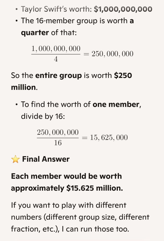Mmm… maybe a quarter of Taylor’s success… divided by 16 members…?!